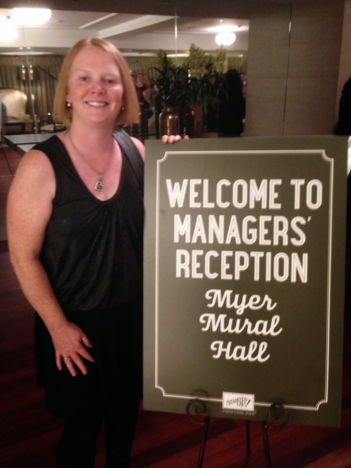 This was the first time I was able to attend the manager's reception on the Wednesday evening before convention started, having been promoted to Manager back in October. We spent the afternoon listening to how we can support our customers and team members, and had fun in a role playing scenario where we were split into different 'cultures'. In the evening we were taken to the Myer Mural Hall in the city centre for a celebratory dinner. To begin, we mingled in the outer hall, and were offered delicious hors d'oeuvres including the most amazing steak and chips on a stick! After a while we went into the Myer Mural Hall itself and found ourselves a table for our meal, as you can see from the menu it was quite a treat! On the tables were gifts for us from Stampin' Up!, presented in a stylish black box with gold lettering on top. Wrapped around the box was a cute tag made using among other things the stamp set contained within the box. We were also spoilt with a beautiful scarf that you can see we wore on the art deco staircases in the hall. (The girls get progressively more crazy the further up the steps they go!) After a group photo (spot me in the front!) we ate our fantastic meal and listened to some great music. What a fabulous night it was, I really hope to be able to go again next year!
